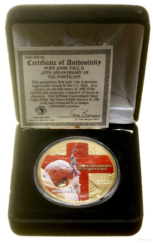 | Opis: | Stany Zjednoczone Ameryki (USA), dolar, 2003, West Point, typ Walking Liberty – z tampondrukiem Jan Paweł II – 25 lat pontyfikatu |