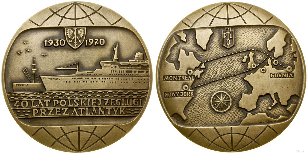 | Opis: | Polska - Polska Rzeczpospolita Ludowa (1952–1989) - Mennica Warszawska, 40 Lat Polskiej Żeglugi przez Atlantyk, 1970, Warszawa, Aw: Widok SS Polonii i MS Batorego, dziobami w lewo, wyżej 1930 - Orzeł - 1970, na dole 40 LAT POLSKIEJ ŻEGLUGI / PRZEZ ATLANTYK, Rw: Widok trasy statków PLO, projektował i wykonał Wacław Kowalik |