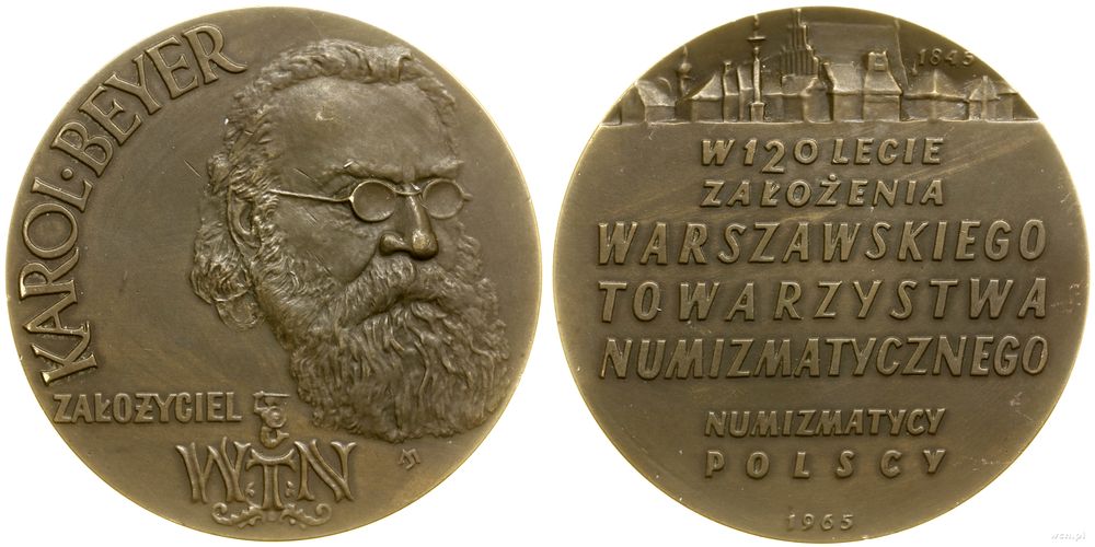 | Opis: | Polska - Polska Rzeczpospolita Ludowa (1952–1989), Karol Beyer, 1965, Warszawa, Aw: Popiersie Karola Beyera lekko w prawo, niżej ZAŁOŻYCIEL WTN, KAROL BEYER, Rw: Widok Starówki Warszawskiej, niżej W 120 LECIE / ZAŁOŻENIA / WARSZAWSKIEGO / TOWARZYSTWA / NUMIZMATYCZNEGO / NUMIZMATYCY / POLSCY / 1965, projektował Maciej Szańkowski |