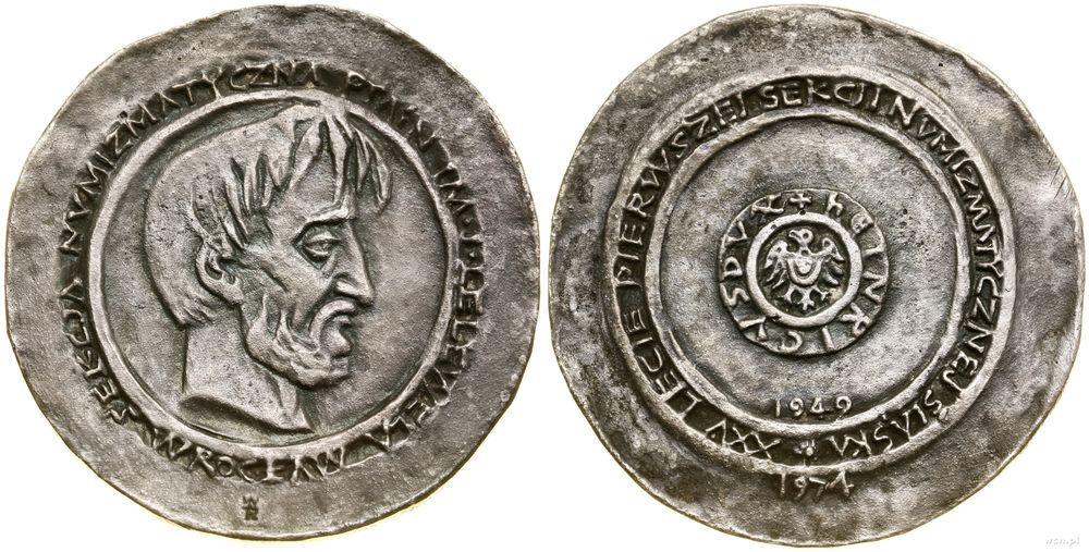 | Opis: | Polska - Polska Rzeczpospolita Ludowa (1952–1989), XXV lat PTAiN Wrocław, 1974, Aw: Głowa w prawo, SEKCJA NUMIZMATYCZNA PTAiN IM. J. LELEWELA - WROCŁAW, Rw: Moneta, niżej 1949 / 1974, XXV LECIE PIERWSZEJ SEKCJI NUMIZMATYCZNEJ ŚLĄSKA, Obrzeże: Punca W.KORSKI, projektował Witold Korski |