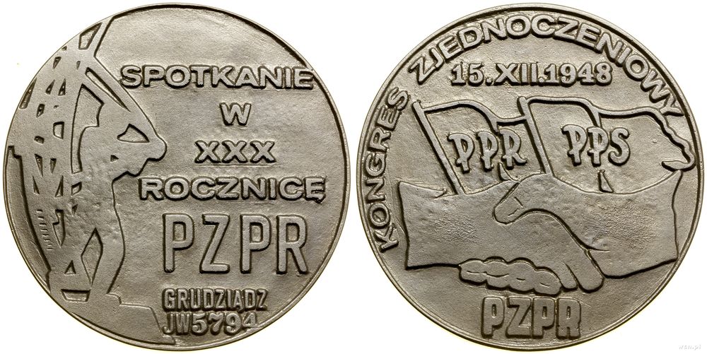 | Opis: | Polska - Polska Rzeczpospolita Ludowa (1952–1989), Spotkanie w XXX Rocznicę PZPR, 1978, Aw: Żołneirz na tle radaru, po prawej SPOTKANIE / W / XXX / ROCZNICĘ / PZPR / GRUDZIĄDZ / JW 5794, Rw: Dwie uściśnięte dłonie na tle sztandarów PPR i PPS, wyżej 15.XII.1948, niżej PZPR, KONGRES ZJEDNOCZENIOWY |