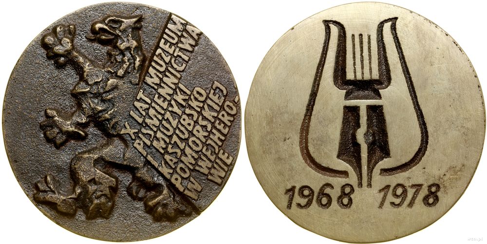 | Opis: | Polska - Polska Rzeczpospolita Ludowa (1952–1989), medal pamiątkowy, 1978, Aw: Gryf w lewo, w miejscu skrzydeł X LAT MUZEUM / PIŚMIENNICTWA / I MUZYKI / KASZUBSKO / POMORSKIEJ / W WEJHERO- / WIE, Rw: Kompozycja złożona z harfy i stalówki pióra, 1968 - 1978 |