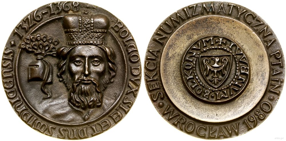 | Opis: | Polska - Polska Rzeczpospolita Ludowa (1952–1989), medal pamiątkowy, 1980, Aw: Popiersie Bolka II Małego na wprost, z lewej hełm w prawo, BOLCO DVX SLE ET DNS SWIDNICENSIS • 1326–1368, Rw: Awers kwartnika Bolka, SEKCJA NUMIZMATYCZNA PTAiN • WROCŁAW 1980 • |