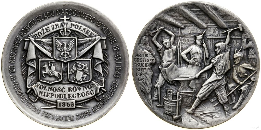 | Opis: | Polska - Polska Rzeczpospolita Ludowa (1952–1989), 120. rocznica pobytu Rządu Narodowego w Kutnie, 1983, Warszawa, Aw: Na płaszczu gronostajowym herby trzech narodów Rzeczypospolitej, wyżej BOŻE ZBAW POLSKĘ, niżej WOLNOŚC RÓWNOŚĆ / NIEPODLEGŁOŚĆ / 1863, W 120 ROCZNICĘ POBYTU RZĄDU NARODOWEGO W KUTNIE 22-25 I 1863 - TOWARZYSTWO PRZYJACIÓL ZIEMI KUTNOWSKIEJ, Rw: Scena kucia kos, z lewej ARTUR / GROTTGER / "KUCIE / KOS" / 1863 / GK, projektował i wykonał Grzegorz Kowalski |