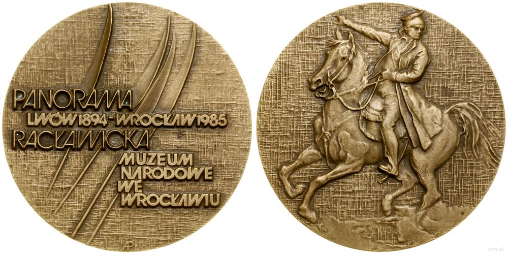 | Opis: | Polska - Polska Rzeczpospolita Ludowa (1952–1989), Panorama Racławicka, 1985, Warszawa, Aw: Cztery kosy, na ich tle PANORMA / LWÓW 1894 - WROCŁAW 1985 / RACŁAWICKA / MUZEUM / NARODOWE / WE / WROCŁAWIU, u dołu monogram AP, Rw: Tadeusz Kościuszko na koniu w lewo, projektowała i wykonała Alfreda Poznańska |