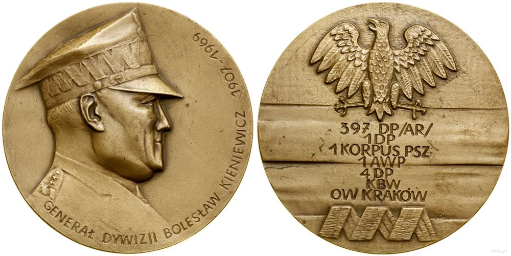| Opis: | Polska - Polska Rzeczpospolita Ludowa (1952–1989), Generał Dywizji Bolesław Kieniewicz, 1987, Warszawa, Aw: Popiersie w prawo, GENERAŁ DYWIZJI BOLESŁAW KIENIEWICZ 1907-1969, Rw: Orzeł piastowski, niżej 397 DP /AP/ / 1 DP / 1 KORPUS PSZ / 1 WP / 4 DP / KBW / OW KRAKÓW, niżej wężyk generalski, projektował i wykonał Bohdan Chmielewski |