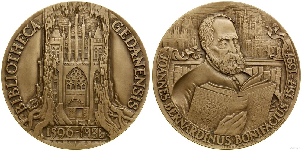 | Opis: | Polska - III Rzeczpospolita Polska (od 1989), 400 lat Biblioteki Gdańskiej, 1996, Warszawa, Aw: Pień drzewa, wewnątrz fasada gotyckiego budynku z napisem na wejściem BIBLIOTEKA GDAŃSKA, na dole 1596-1996, BIBLIOTHECA - GEDANENSIS, Rw: Półpostać z księgą lekko w prawo, w tle półki z książkami oraz charakterystyczne budynki Gdańska, JOANNES BERNARDINUS BONIFACIUS 1517-1597, projektował i wykonał Wawrzyniec Samp |