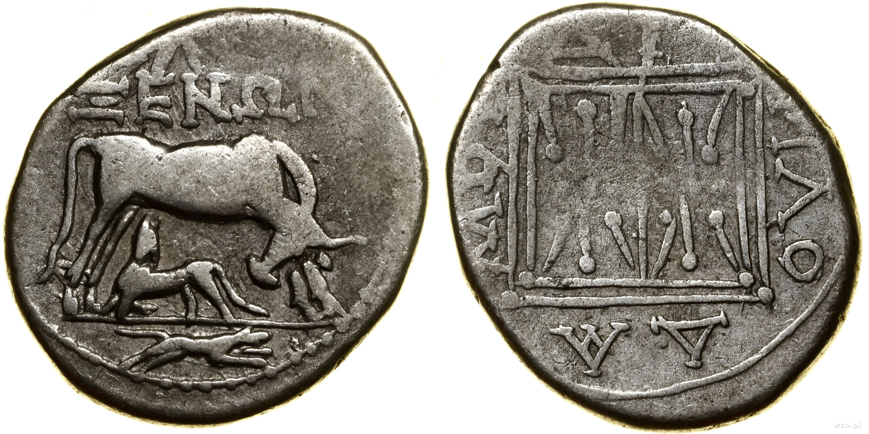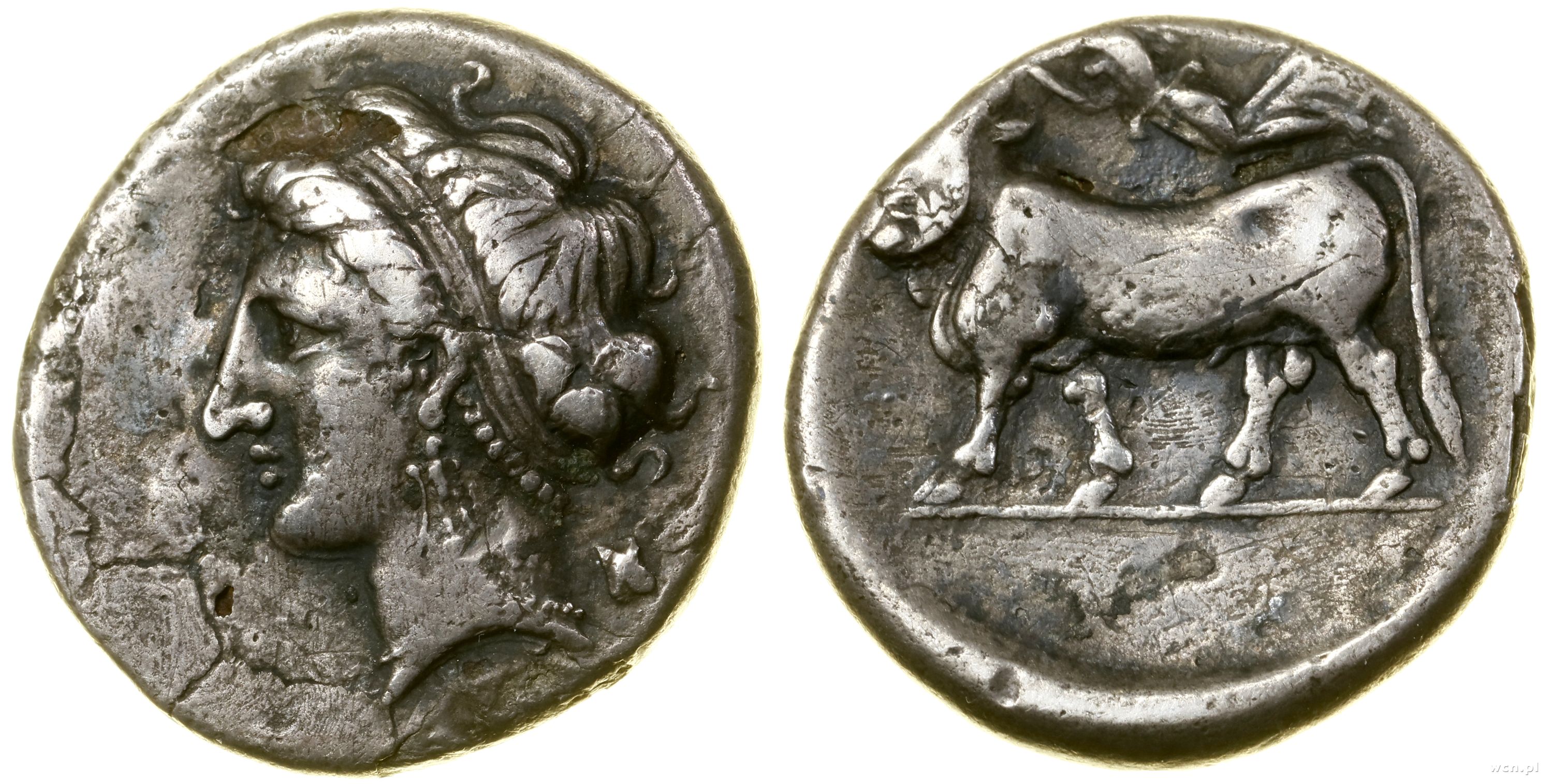 Aw: Głowa nimfy z opaską na włosach w lewo, Rw: Byk z lud... | III/III- |