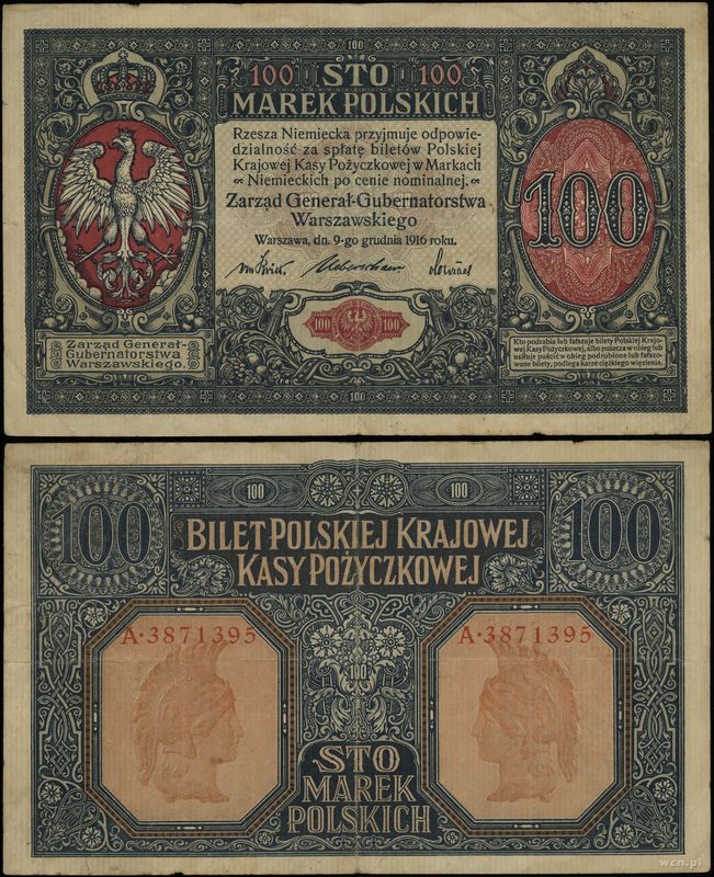 | Opis: | Polska - Generalne Gubernatorstwo Warszawskie (1915–1918), 100 marek polskich, 9.12.1916, Generał, seria A, numeracja 3871395 |