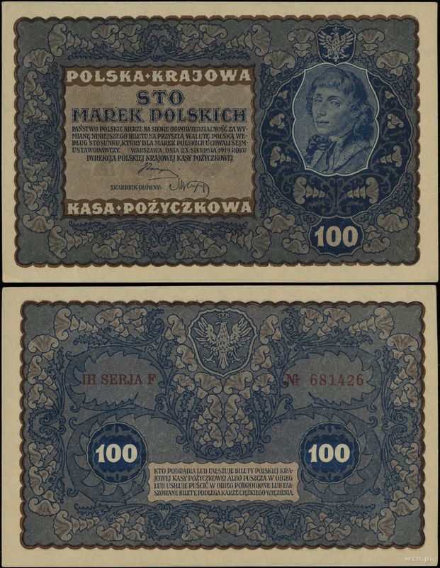 | Opis: | Polska - II Rzeczpospolita Polska (1918–1939) - emisje przed reformą Władysława Grabskiego, 100 marek polskich, 23.08.1919, seria IH-F, numeracja 681426 |