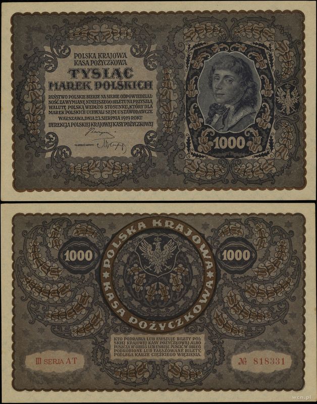 | Opis: | Polska - II Rzeczpospolita Polska (1918–1939) - emisje przed reformą Władysława Grabskiego, 1.000 marek polskich, 23.08.1919, seria III-AT, numeracja 818331 |