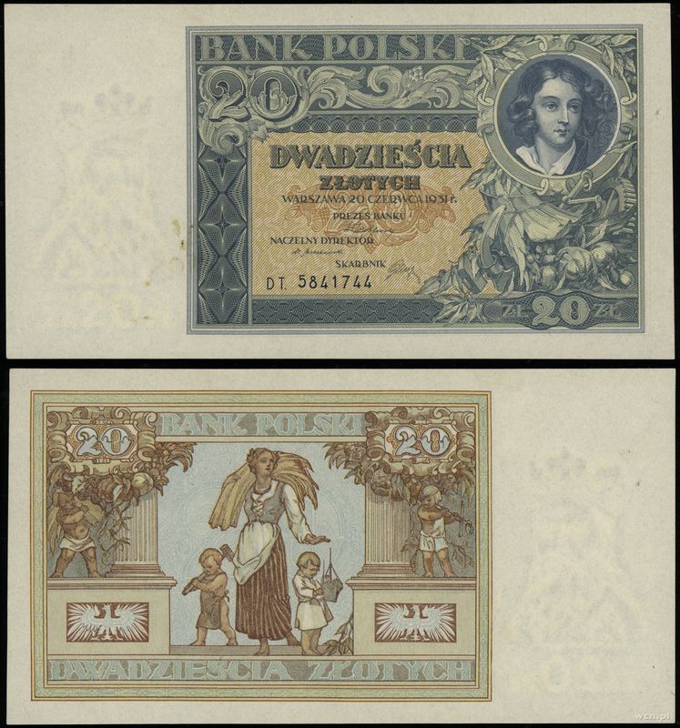 | Opis: | Polska - II Rzeczpospolita Polska (1918–1939) - emisje po reformie Władysława Grabskiego, 20 złotych, 20.06.1931, seria DT., numeracja 5841744 |