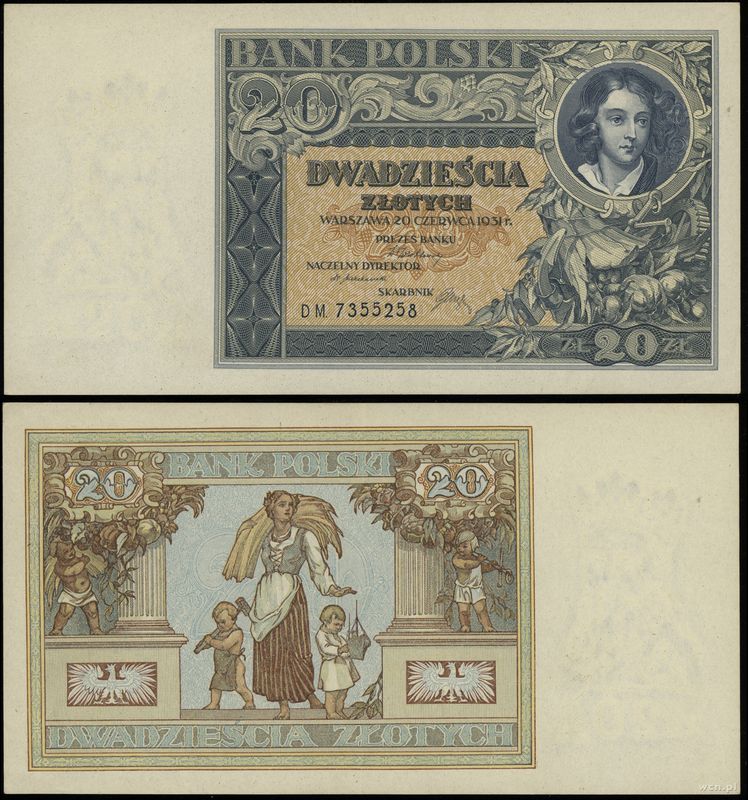 | Opis: | Polska - II Rzeczpospolita Polska (1918–1939) - emisje po reformie Władysława Grabskiego, 20 złotych, 20.06.1931, seria DM., numeracja 7355258 |