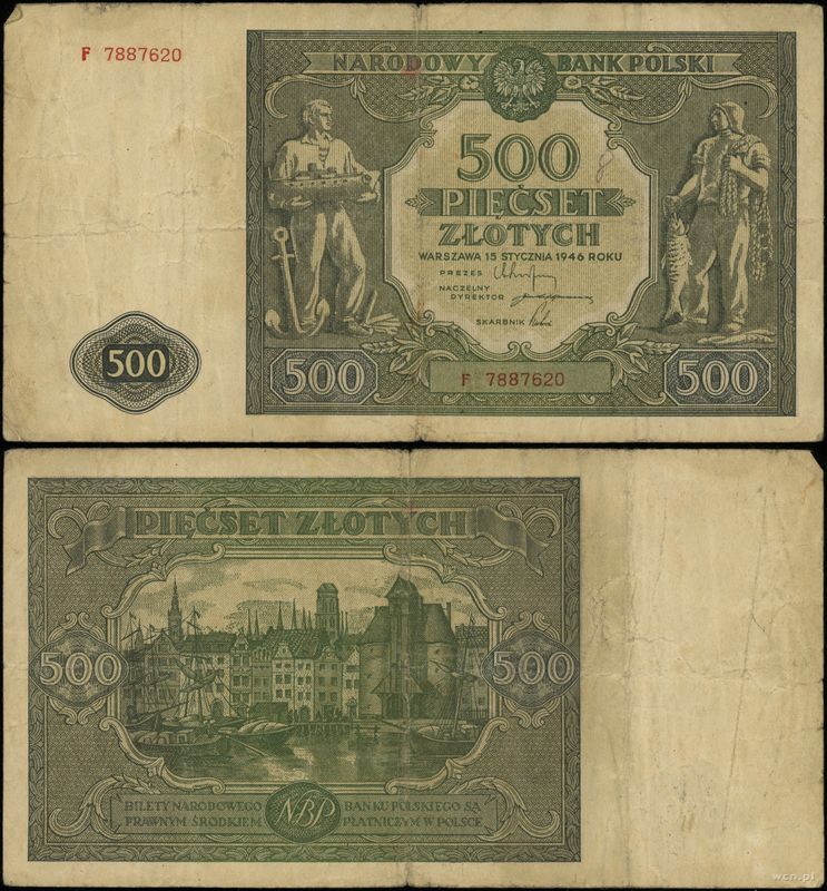 | Opis: | Polska - Polska powojenna (1944–1952), 500 złotych, 15.01.1946, seria F, numeracja 7887620 |
