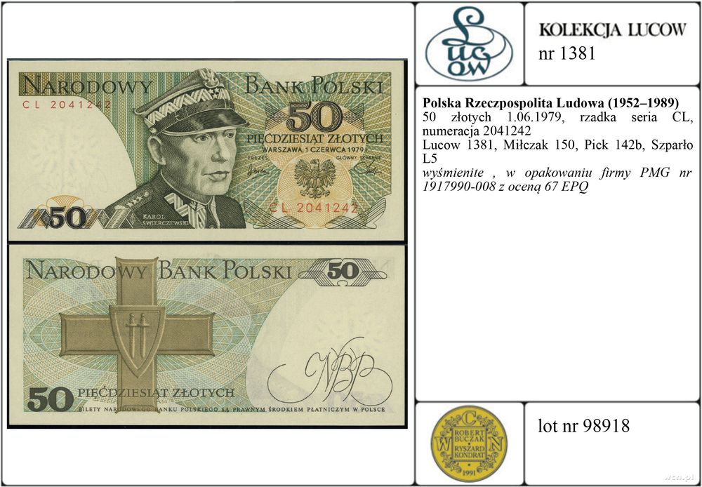 | Opis: | Polska - Polska Rzeczpospolita Ludowa (1952–1989), 50 złotych, 1.06.1979, rzadka seria CL, numeracja 2041242 |