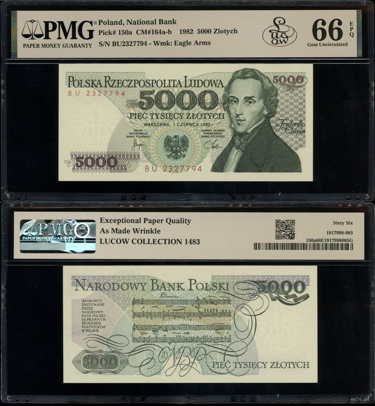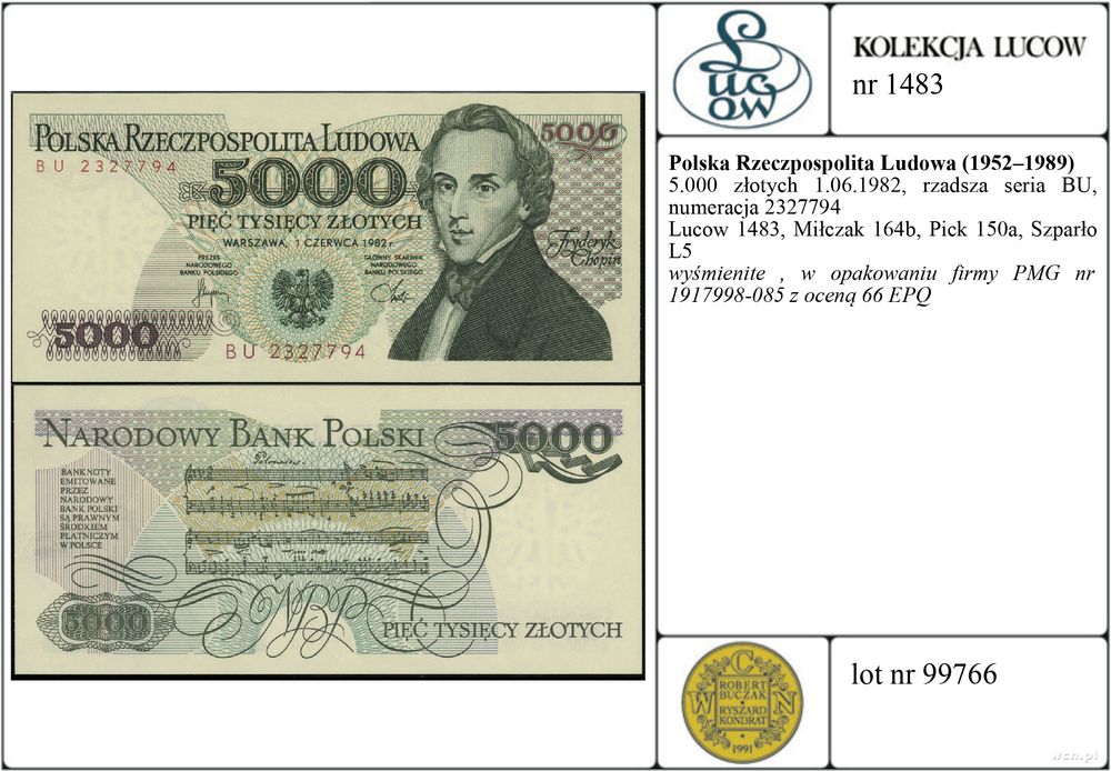 | Opis: | Polska - Polska Rzeczpospolita Ludowa (1952–1989), 5.000 złotych, 1.06.1982, rzadsza seria BU, numeracja 2327794 |