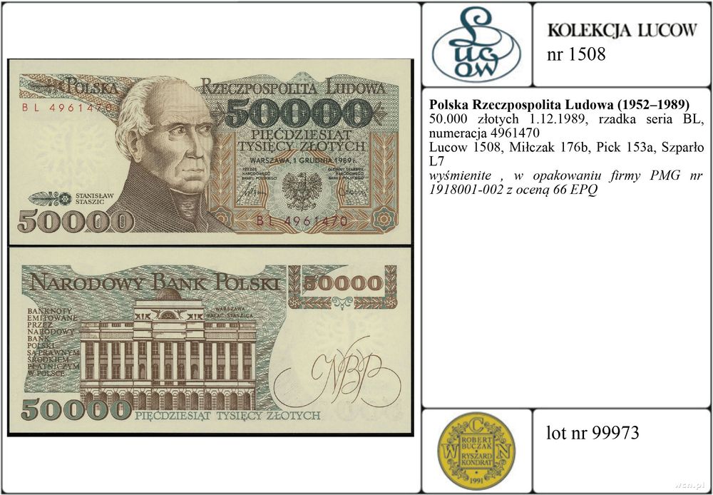 | Opis: | Polska - Polska Rzeczpospolita Ludowa (1952–1989), 50.000 złotych, 1.12.1989, rzadka seria BL, numeracja 4961470 |