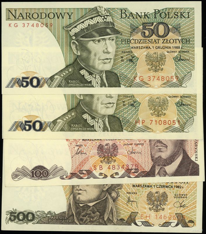 | Opis: | Polska - Polska Rzeczpospolita Ludowa (1952–1989), zestaw 4 banknotów, 1982–1988, 1) 50 złotych 1.12.1988 seria KG (st. I/I-) 2) 50 złotych 1.12.1988 seria HP (st. II+) 3) 100 złotych 1.06.1986 seria SB (st. II) 4) 500 złotych 1.06.1982 seria EH (st. II) |