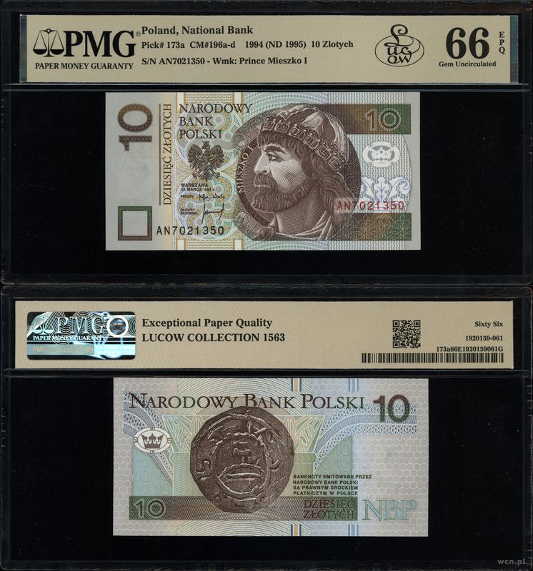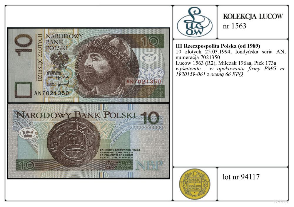 | Opis: | Polska - III Rzeczpospolita Polska (od 1989), 10 złotych, 25.03.1994, londyńska seria AN, numeracja 7021350 |