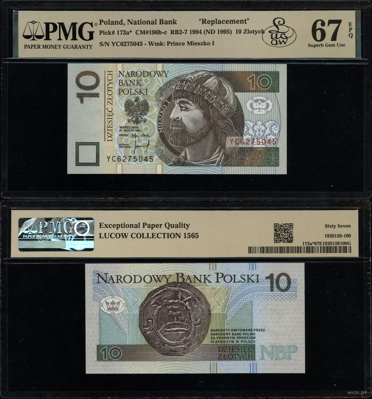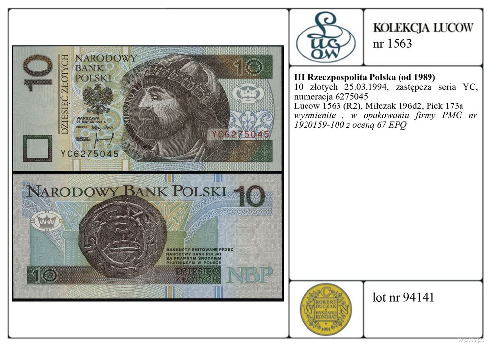 | Opis: | Polska - III Rzeczpospolita Polska (od 1989), 10 złotych, 25.03.1994, zastępcza seria YC, numeracja 6275045 |