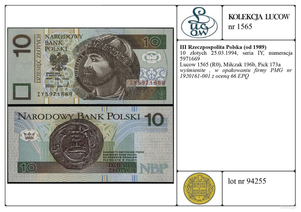 | Opis: | Polska - III Rzeczpospolita Polska (od 1989), 10 złotych, 25.03.1994, seria IY, numeracja 5971669 |