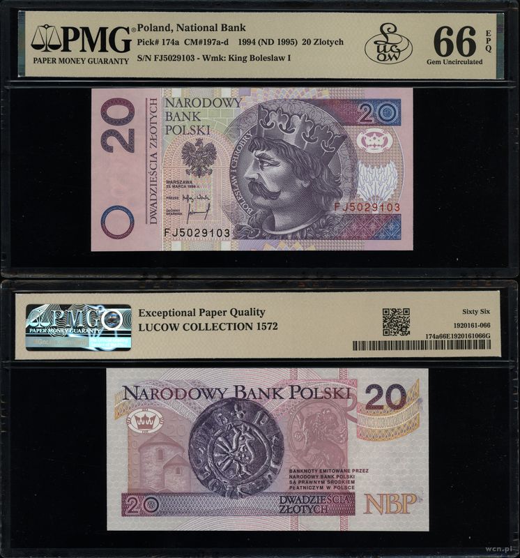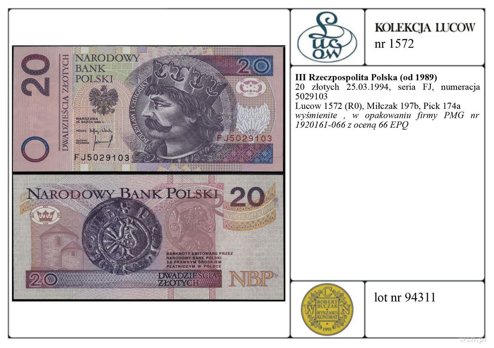 | Opis: | Polska - III Rzeczpospolita Polska (od 1989), 20 złotych, 25.03.1994, seria FJ, numeracja 5029103 |