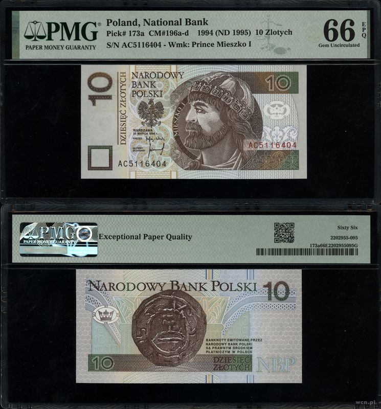 | Opis: | Polska - III Rzeczpospolita Polska (od 1989), 10 złotych, 25.03.1994, seria londyńska AC, numeracja 5116404 |