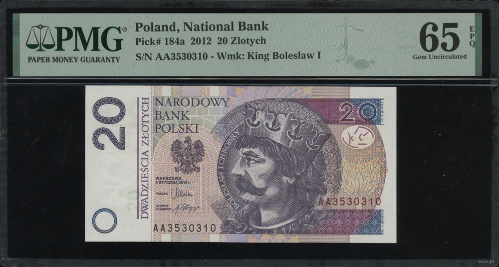 | Opis: | Polska - III Rzeczpospolita Polska (od 1989), 20 złotych, 5.01.2012, seria AA, numeracja 3530310 |