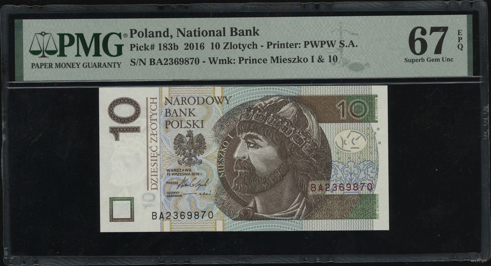 | Opis: | Polska - III Rzeczpospolita Polska (od 1989), 10 złotych, 15.09.2016, seria BA, numeracja 2369870 |