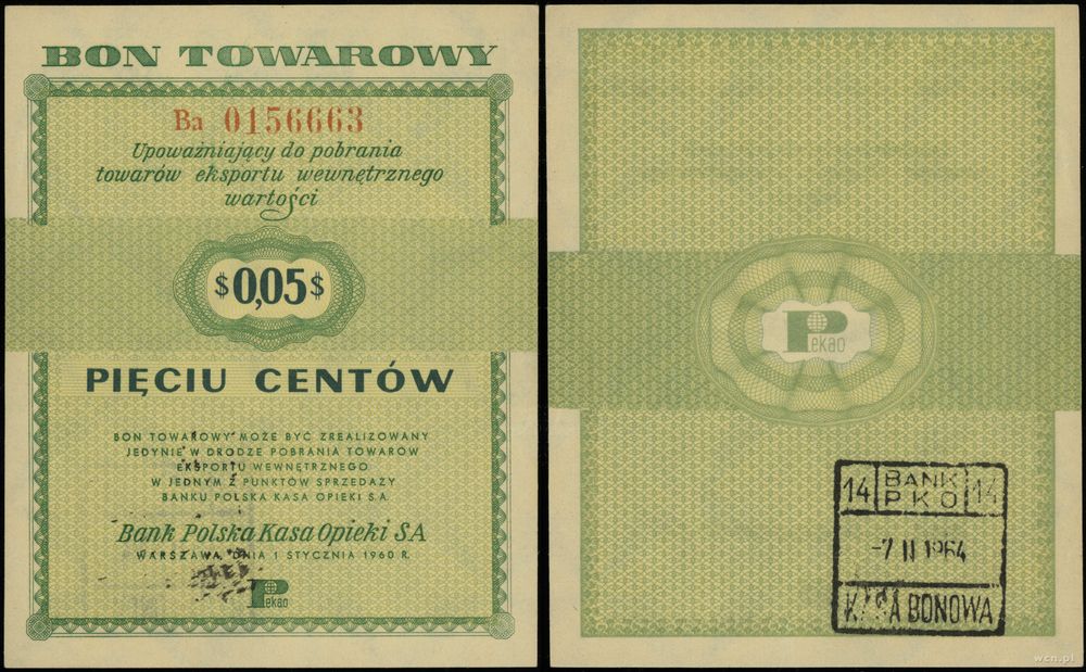 | Opis: | Polska - Bony towarowe - Bank Polska Kasa Opieki S.A., bon na 5 centów, 1.01.1960, seria Ba, numeracja 0156663, ze stemplem na stronie odwrotnej, ale bez klauzuli |