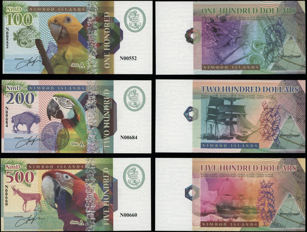| Opis: | fantazyjne, zestaw 6 bankotów fantazyjnych, w skład zestawu wchodzą banknoty 10, 20, 50, 100, 200, 500 dolarów z Wysp Nimroda |