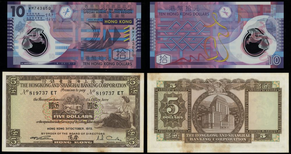 | Opis: | Hong Kong, zestaw: 5 i 10 dolarów, 1972 i 2014, 1) 5 dolarów 31.10.1972 seria ET (st. I/I-) 2) 10 dolarów 1.01.2014 seria WM (st. I) - polimerowy banknot |