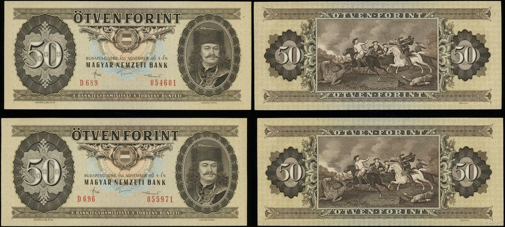| Opis: | zestaw różnych banknotów, zestaw 5 banknotów, 1961–1987, 1) 2 x 50 forintów 1986 Węgry (I/I-) 2) 50 koron 1987 Czechosłowacja (I/I-) 3) 5 marek 1964 Niemcy (II/II-) 4) 10 rubli 1961 Rosja (st. III) |