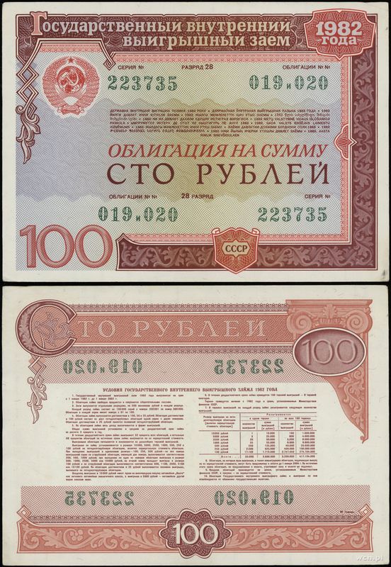 | Opis: | Rosja - ZSRS (1922–1991), obligacja na 100 rubli, 1982, seria 223735, numeracja 019 i 020 |