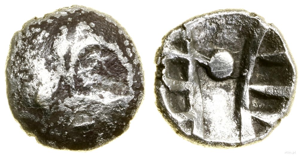 | Opis: | Bojowie, 1/8 statera - podobne do typu Walenta, (ok. I w. pne), mennica celtycka pod Kaliszem, Aw: Słabo czytelne, nieregularne wypukłości; Rw: Dwa przeciwstawne łuki pionowo, po każdej ze stron trzy poziome żeberka, pomiędzy łukami kropka, od którek wychodzi żeberko |