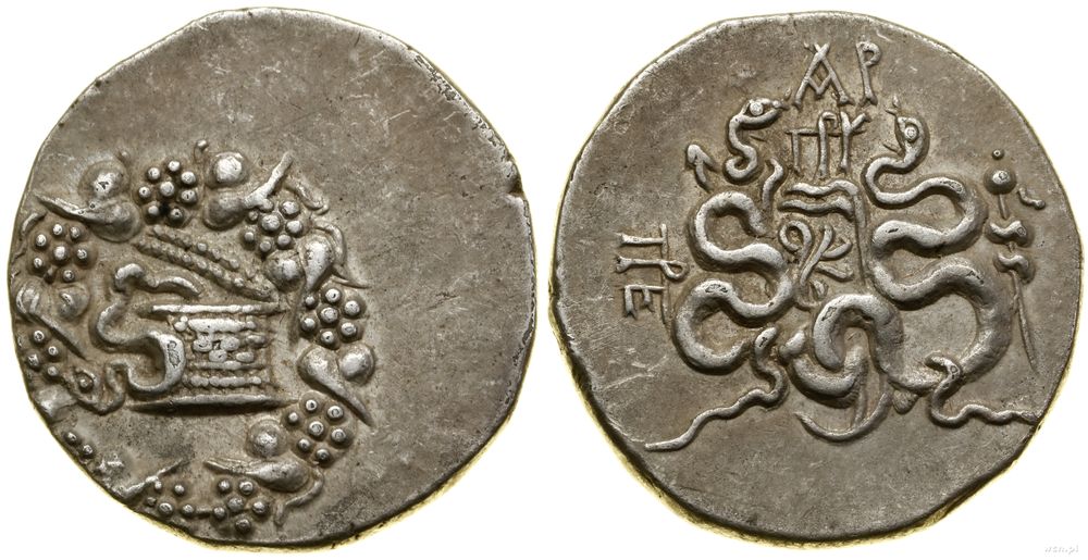 | Opis: | Grecja i posthellenistyczne - Myzja - Pergamon, cystofor, (ok. 166–67 pne), Aw: Cista mystica z wężami, wewnątrz wieńca z bluszczu i kwiatów, Rw: Kołczan z łukiem między dwoma wężami, po lewej i u góry monogramy, z prawej asklepios |