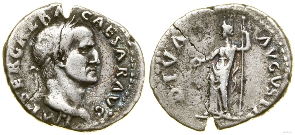 | Opis: | Cesarstwo Rzymskie - Galba (68–69), denar, (68–69), Rzym, Aw: Głowa cesarza w prawo, IMP SER GALBA CAESAR AVG, Rw: Stojąca Liwia w lewo, trzymająca paterę i długie berło, DIVA AVGVSTA |