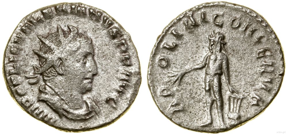 | Opis: | Cesarstwo Rzymskie - Walerian I (253–260), antoninian bilonowy, (253–260), Rzym, Aw: Popiersie władcy w koronie radialnej w prawo, IMP C P LIC VALERIANVS P F AVG, Rw: Apollo stojący na wprost, trzymający lirę oraz gałązke, APOLLINI CONSERVA |