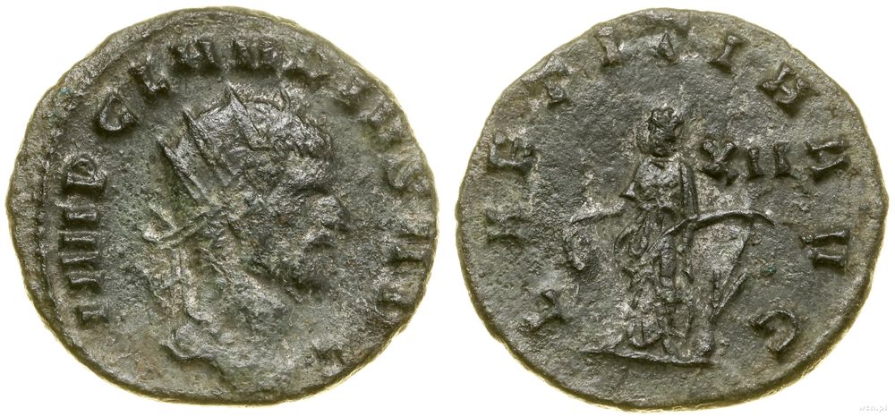 | Opis: | Cesarstwo Rzymskie - Klaudiusz II Gocki (268–270), antoninian bilonowy, (268–270), Rzym, Aw: Popiersie cesarza w koronie radialnej w prawo, IMP CLAVDIVS AVG, Rw: Laetitia stojąca w lewo, trzymająca wieniec i róg obfitości, LAETITIA AVG, w polu po prawej XII |