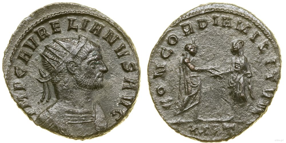 | Opis: | Cesarstwo Rzymskie - Aurelian (270–275), antoninian bilonowy, (274–275), Siscia, Aw: Popiersie cesarza w koronie radialnej w prawo, IMP C AVRELIANVS AVG, Rw: Cesarz uściskujący dłoń stojącej naprzeciwko Concordii, CONCORDIA MILITVM, w odcinku XXIT |