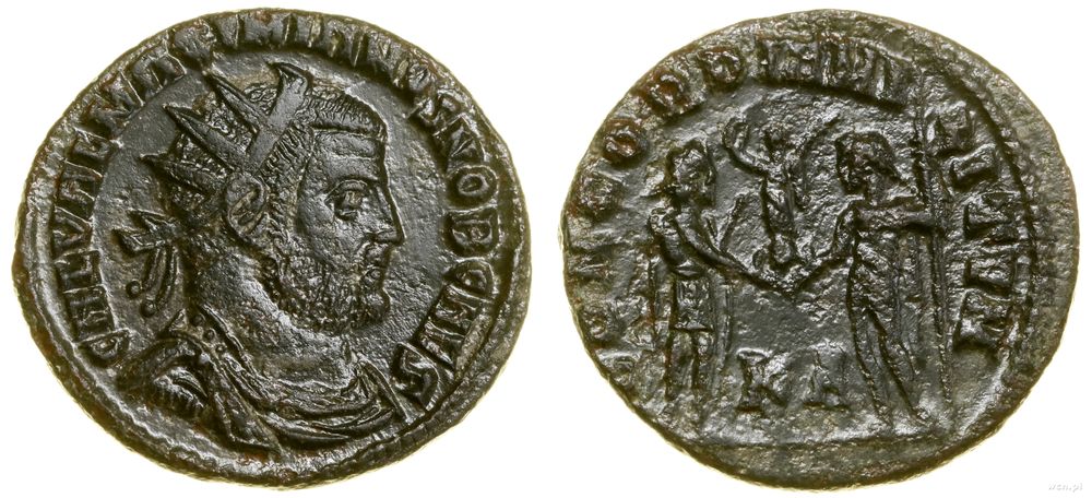| Opis: | Cesarstwo Rzymskie - Galeriusz (305–311) - jako cezar 293–305, antoninian bilonowy, (295–299), Cyzicus, Aw: Popiersie cezara w koronie radialnej w prawo, GAL VAL MAXIMIANVS NOB CAES, Rw: Władca stojący w prawo, odbierający od Jupitera Wiktorię na globie, CONCORDIA MILITVM, w polu KA |