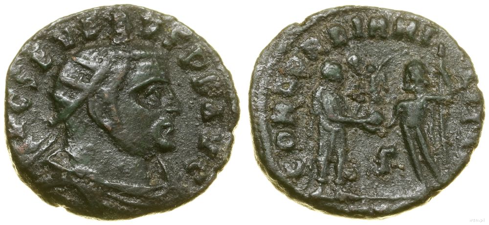 | Opis: | Cesarstwo Rzymskie - Sewer II (305–307), nummus bilonowy (radiatus), (306–307), Aleksandria, Aw: Popiersie władcy w koronie radialnej w prawo, IMP C SEVERVS P F AVG; Rw: Władca stojący w prawo, odbierający od Jupitera Wiktorię na globie, CONCORDIA MILITVM, w polu Γ, w odcinku ALE |
