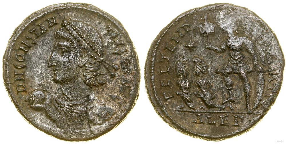 | Opis: | Cesarstwo Rzymskie - Konstancjusz II (324–361), follis, (348–350), Aleksandria, Aw: Głowa cesarza w lewo, D N CONSTANTIVS P F AVG; Rw: Cesarz w stroju wojskowym, trzymający tarczę i sztandar u jego stóp dwaj jeńcy, FEL TEMP REPARATIO / ALEΓ |