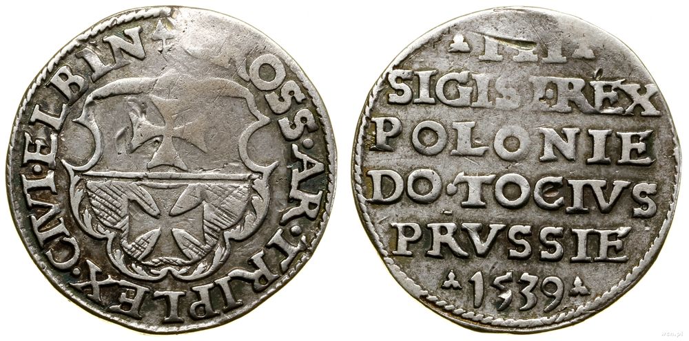 | Opis: | Polska - Zygmunt I Stary (1506–1548) - miasto Elbląg, trojak, 1539, Elbląg, w legendzie awersu ELBIN |