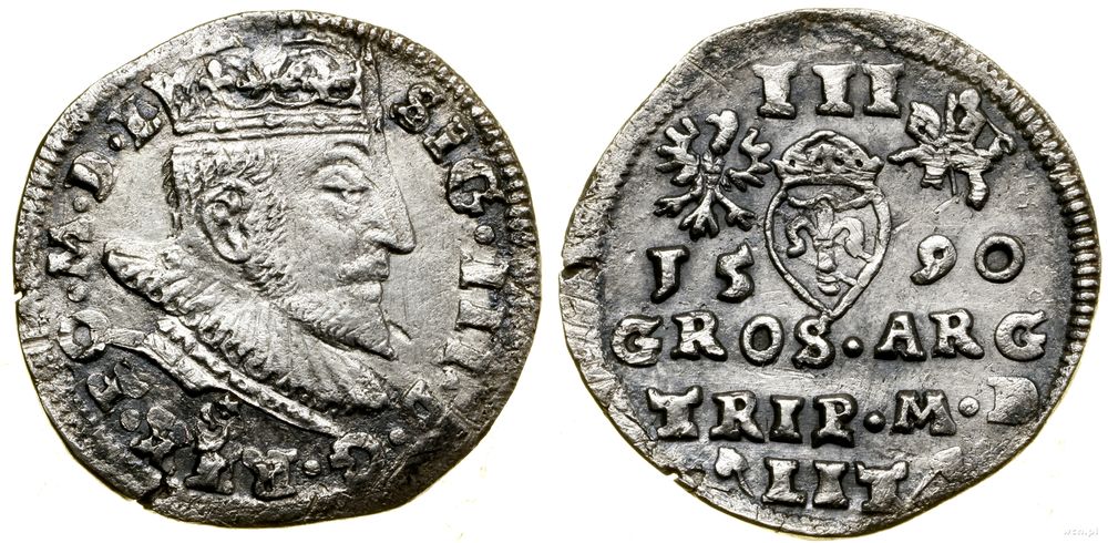 | Opis: | Polska - Zygmunt III Waza (1587–1632) - monety litewskie, trojak, 1590, Wilno, rzadsza odmiana z herbem Leliwa pod popiersiem króla, końcówka legendy awersu L |