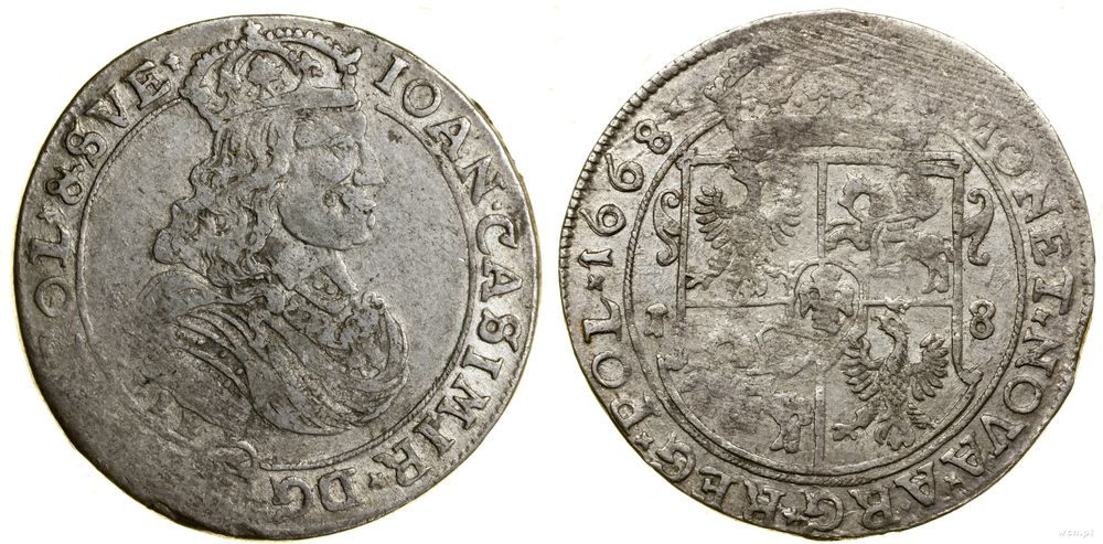 | Opis: | Polska - Jan II Kazimierz Waza (1649–1668) - monety koronne, ort, 1668 TLB, Bydgoszcz, herb Ślepowron pod popiersiem, ozdobniki po bokach tarczy herbowej, MONET NOVA w legendzie rewersu |