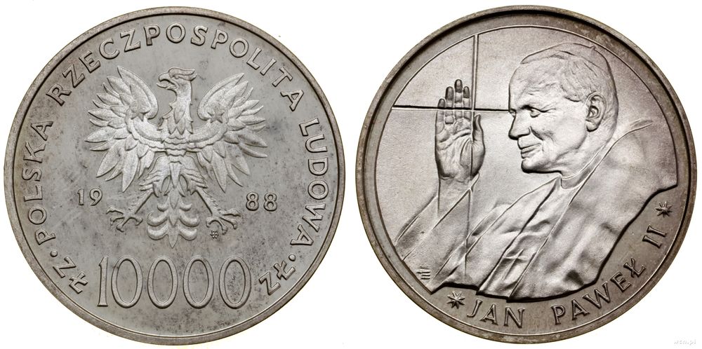 | Opis: | Polska - Polska Rzeczpospolita Ludowa (1952–1989) - monety obiegowe i kolekcjonerskie, 10.000 złotych, 1988, Warszawa, Jan Paweł II – popiersie w lewo z uniesioną dłonią |