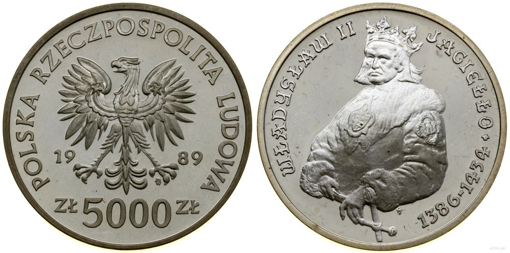 | Opis: | Polska - Polska Rzeczpospolita Ludowa (1952–1989) - monety obiegowe i kolekcjonerskie, 5.000 złotych, 1989, Warszawa, Władysław II Jagiełło (1386-1434) /półpostać/ |