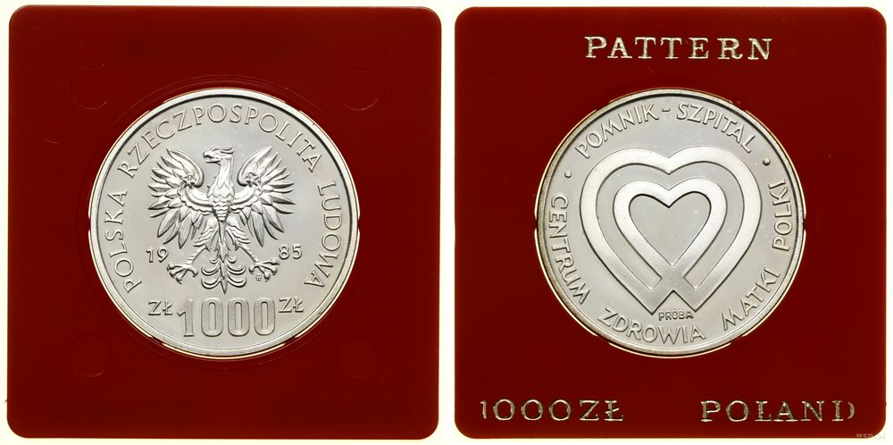| Opis: | Polska - Polska Rzeczpospolita Ludowa (1952–1989) - monety próbne, 1.000 złotych, 1985, Warszawa, Pomnik-Szpital Centrum Zdrowia Matki Polki, wypukły napis PRÓBA |