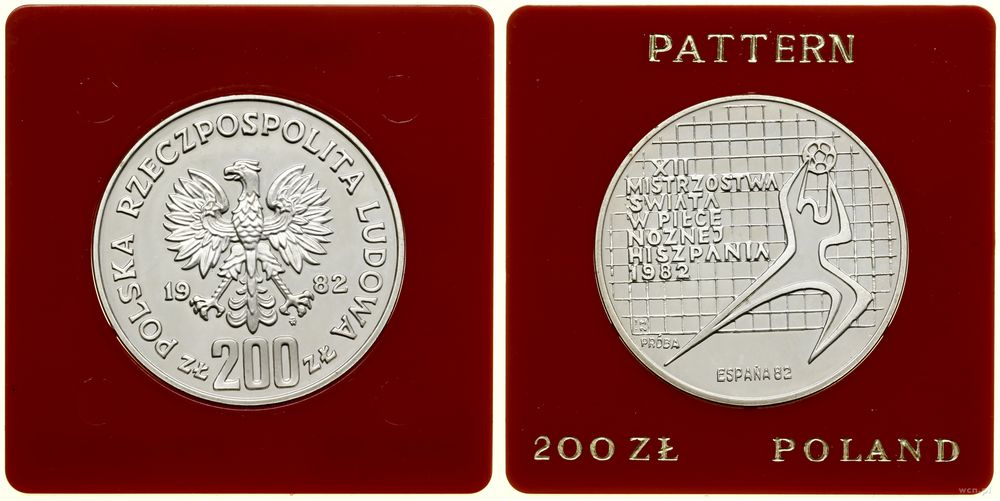 | Opis: | Polska - Polska Rzeczpospolita Ludowa (1952–1989) - monety próbne, 200 złotych, 1982, Warszawa, XII Mistrzostwa Świata W Piłce Nożnej - Hiszpania 1982 (bramkarz w prawo), wypukły napis PRÓBA |